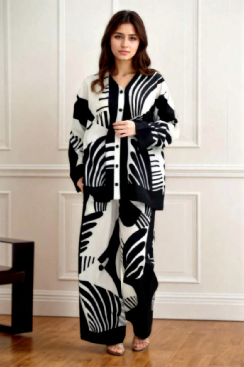 Step out in style with this black and white abstract co-ord set, perfect for casual outings and statement everyday looks.