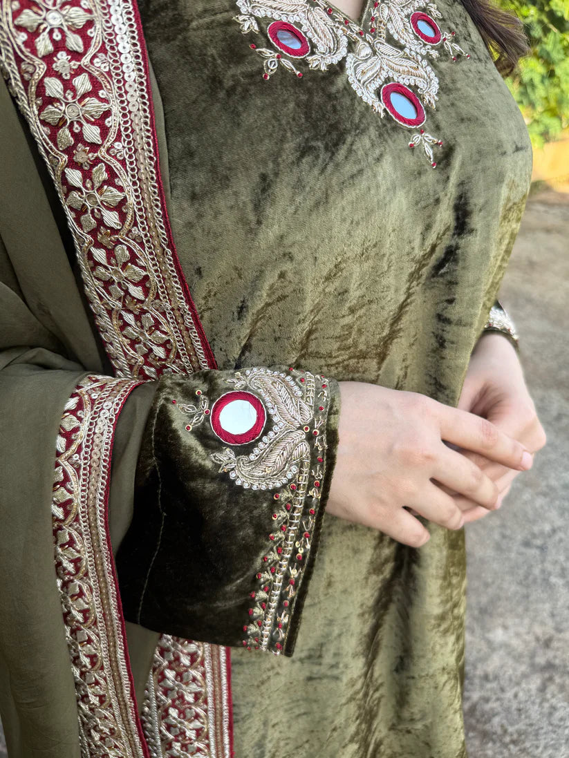 Sap Green Velvet Silk Kurta Set with Zardosi & Coin Highlights